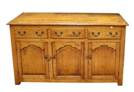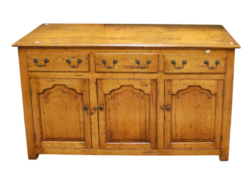 An early 20th century oak sideboard. Of pegged construction having three drawers over three moulded panelled cupboard doors, raised on stile supports. H88cm x W152cm x D53cm