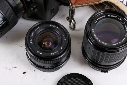 Two suitcases with a collection of assorted vintage 35mm film cameras. Including compact, SLR, lenses and cases, etc.