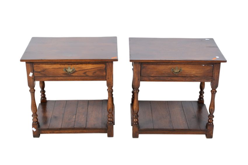 Pair of 20th century stained oak low side tables. Each having a drawer with lower under tier shelf. H58cm x W61cm x D45cm