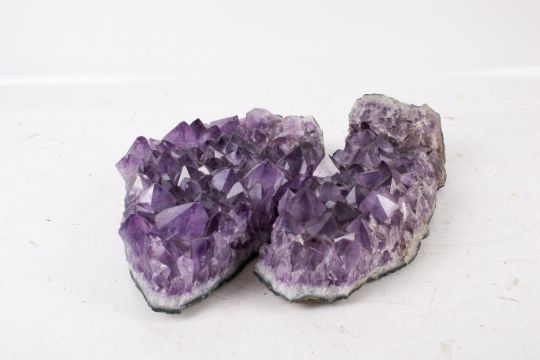Natural amethyst quartz crystal cluster specimen, broken in two. Approximately 21cm x 21cm