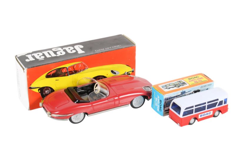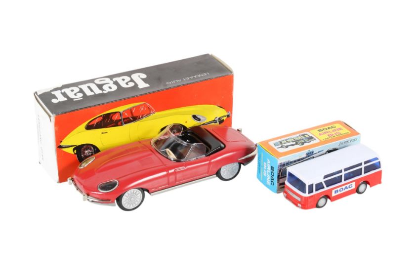 Two vintage friction driven vehicles. Comprising a Lemez (Hungary) Jaguar and a Hong Kong BOAC Airline bus, No.444A, in the original boxes