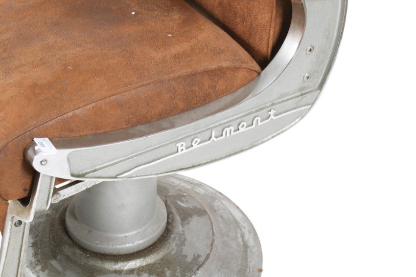A vintage Belmont barbers chair. With faux brown leather upholstery. Raised on a hydraulic base. H102cm.