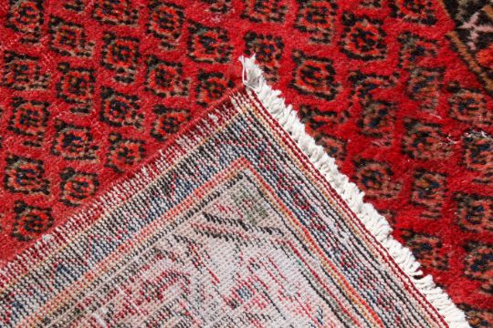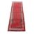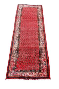 A red ground handmade runner. Decorated with a central rectangular reserve of small floral patterns within a beige ground border of geometric motifs. 220cm x 76cm