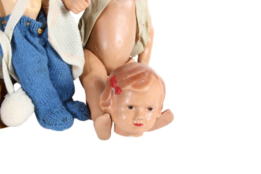 An assortment of vintage dolls. Including a Heubach Koppelsdorf bisque headed doll, No.3425, with painted features and blinking eyes, L48cm, two German examples and more, (all AF)