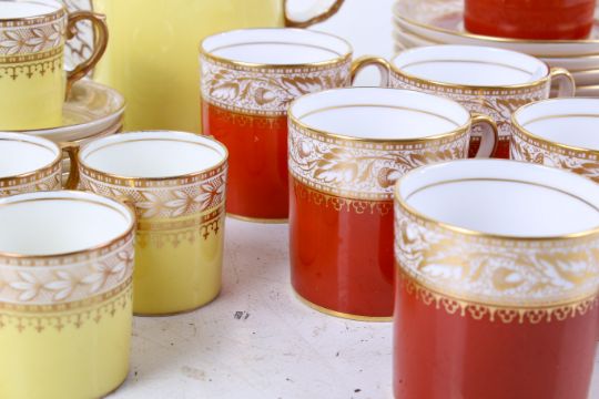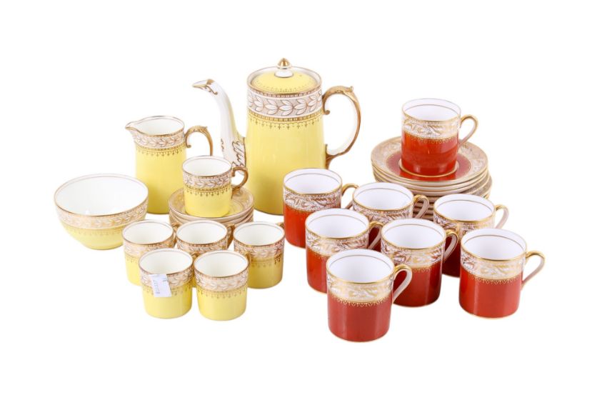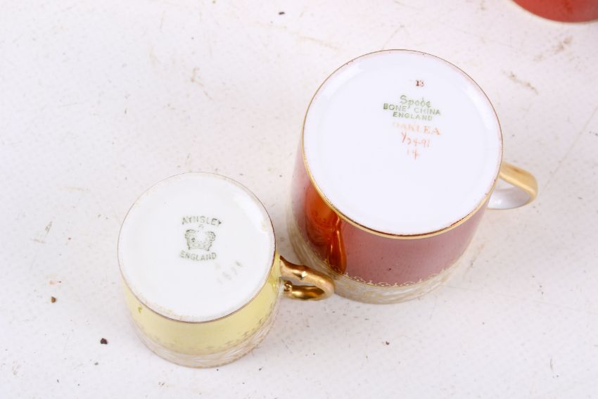 Two coffee cans sets. Consisting of a set Aynsley, mostly for six and a set of Spode Oaklea, mostly for eight. Max. H15cm