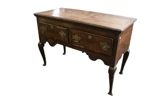 Holes drilled into top for attaching upper section (missing). Two handles loose but present. Old crack to right hand side. Some parts of edges of drawer fronts missing. A rectangular hole under middle section of lower frieze - possible decorative piece missing. Damage and loss to feet.