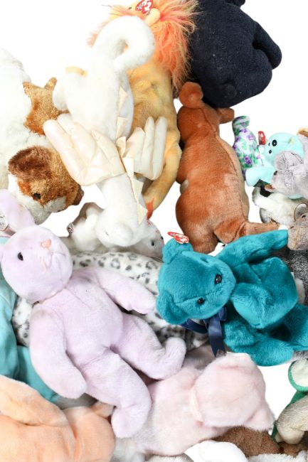 Two boxes of assorted TY beanie babies soft toys. Various sizes, most with original tags including 'Chewy' and 'Tromps', etc.