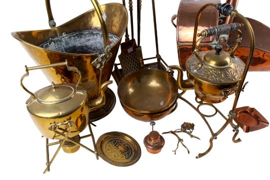A large collection of brass and coppers fire side items. Including coal skuttles and fire irons, etc. Max. H76cm