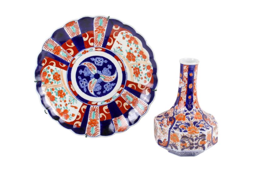 A large 20th century Imari charger with crimped rim and a similar octagonal vase. Max. H28cm
