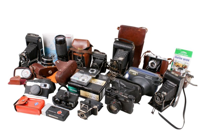 A collection of assorted vintage film cameras. Including Fujifilm instax 200, Kodak no. 3 autograph model H, Zeiss ikon compur, yashica electro 35, contessa lk, etc. Several with leather cases, etc.