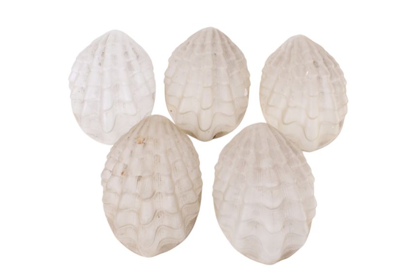 A collection of five Deco glass wall lamp shades modelled as clamp shells. Having a hole to one end, each measures 17cm long