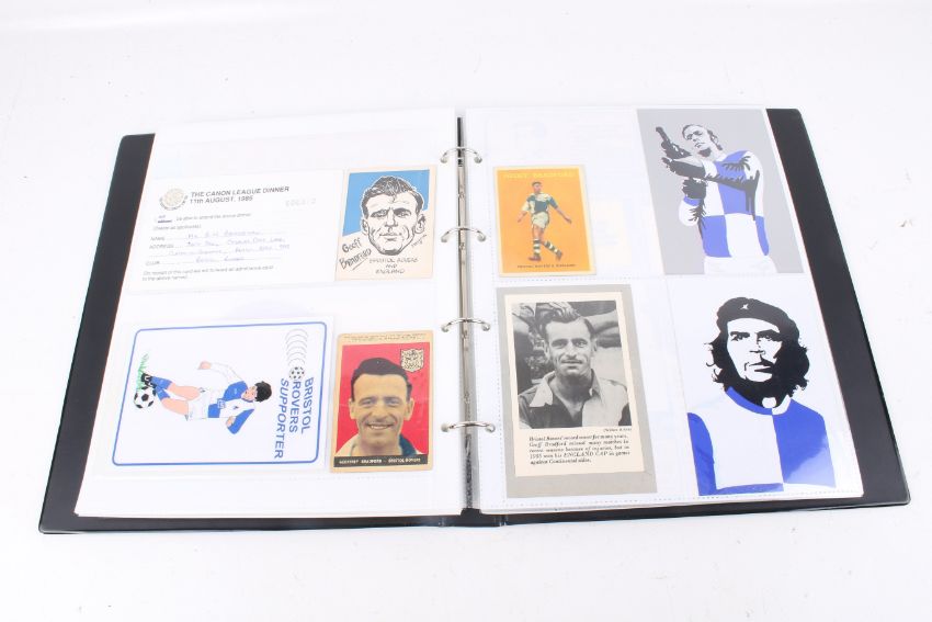 An extensive collection of vintage Bristol Rovers Football Club memorabilia. Including Supporters Club cards, photographs, a 1936-37 fixtures booklet, 1953-54 fixtures booklet, newspaper clippings, illustrative cards of the 1940s and 1950s teams, cartoons, 1954 Christmas Card, 1980 Supporters Club Shop Souvenir Price List, a rosette, multiple cigarette cards and 'Famous Football' cards issued by Barratt & Co Ltd, Ogdens, Cadet Sweets, Cohen Weenen & Co, etc. Supporters Club Membership Cards and more