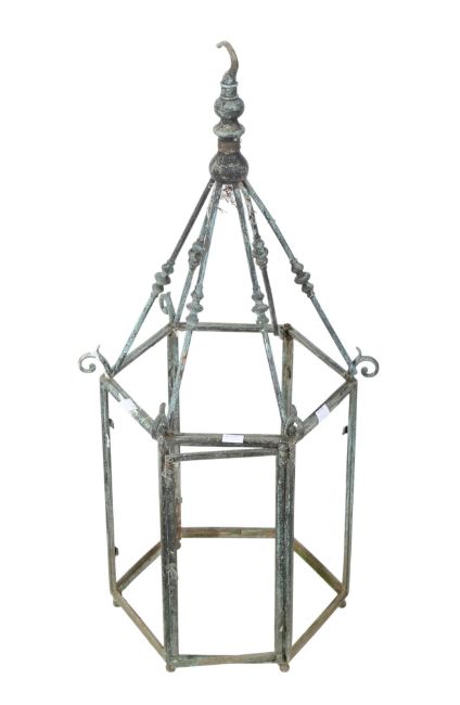 A verdigris metal hall pendant lantern frame. Of hexagonal form with a door. H86cm