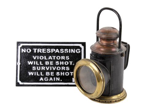 A vintage Railway brass and copper signal lantern and a reproduction metal sign. Max. H34cm