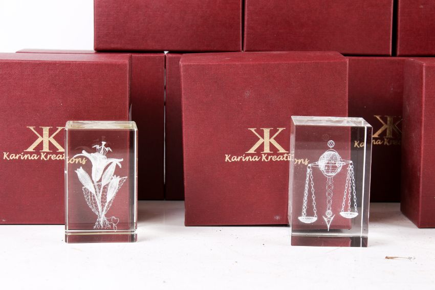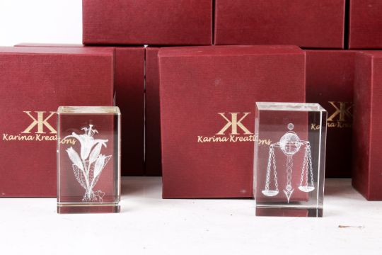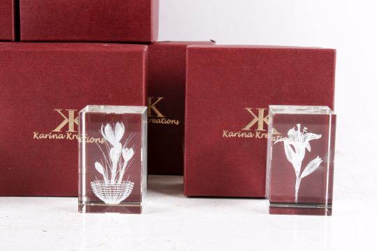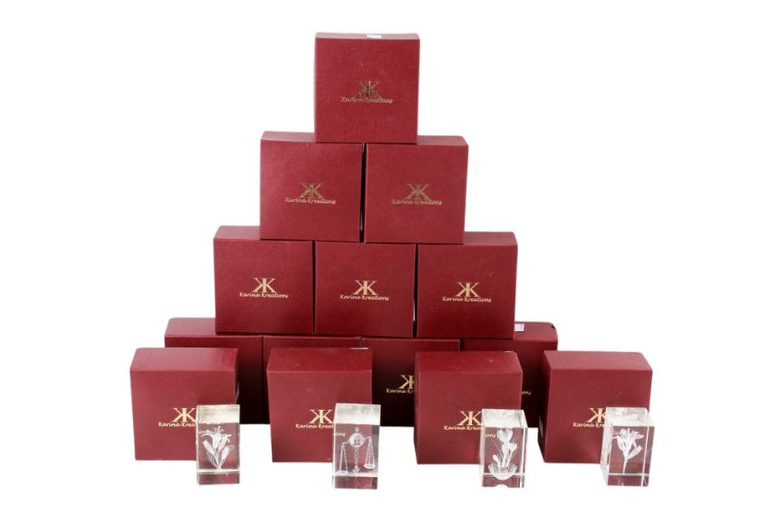 Fourteen assorted Karina Kreations glass paperweights, boxed. Max. H8cm
