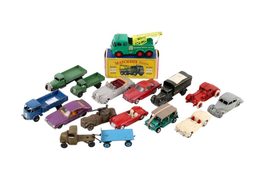 A collection of diecast model vehicles. Including a Matchbox King Size K-12 Heavy Breakdown Wreck Truck, Dinky Trucks, Dinky No.194 Bentley S2, Corgi MGA and more