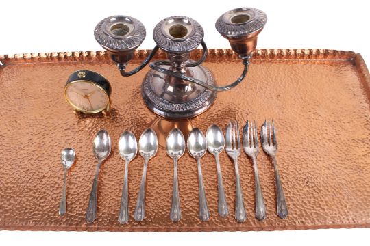 A group of assorted metalware items. Including a rectangular copper tray and a silver plated candelabra, etc. Max. H13cm