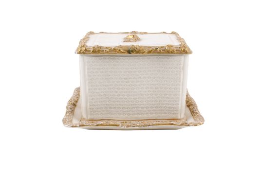 A continental gilt porcelain box with cover and stand. Blue crown mark to base, H9cm
