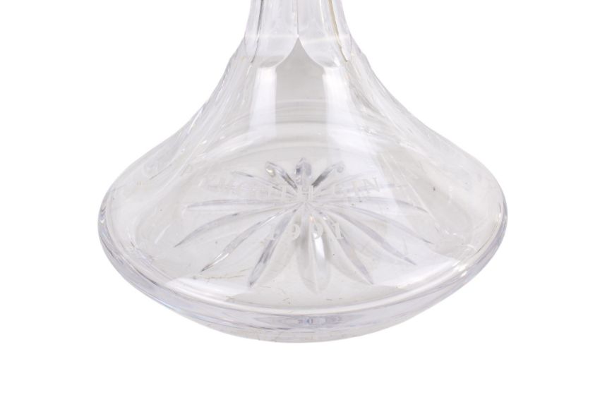 A group of crystal decanters and glass hurricane lamps. Comprising a ships decanter, Plymouth Gin ships decanter, Dartington ships decanter, Waterford Lismore decanter and three hurricane lamps. Max. H23cm