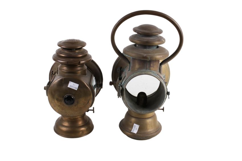 Two vintage brass lamps. Both having circular lenses, one with a handle to the top, H37cm