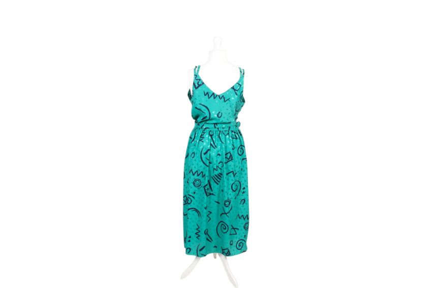 A vintage dress and jacket set. Circa 1980s, constructed of polyester fabric in a printed green and blue pattern, the sleeveless dress with a gathered waist annd matching belt, size 12, L127cm, the peplum jacket with button fastenings, size 12, L69cm
