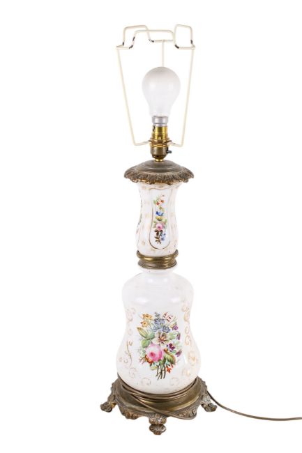 An early 20th century porcelain table lamp. The lamp having a moulded brass collar, the column glazed in white and decorated with hand painted floral motifs surrounded by gilt scrolling and latticework, mounted on a brass base with scroll feet, H44cm (excluding fittings)