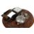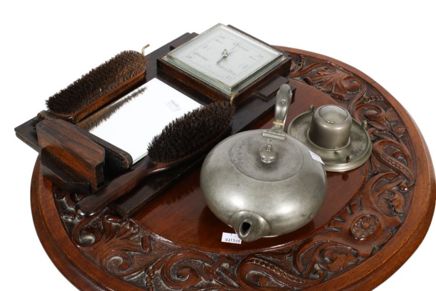 A side table and a group of collectables. The oval table with a carved border, together with a pewter teapot, inkwell, and a hanging barometer vanity set. Table H65cm x W64cm x D58cm.