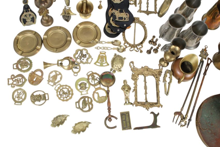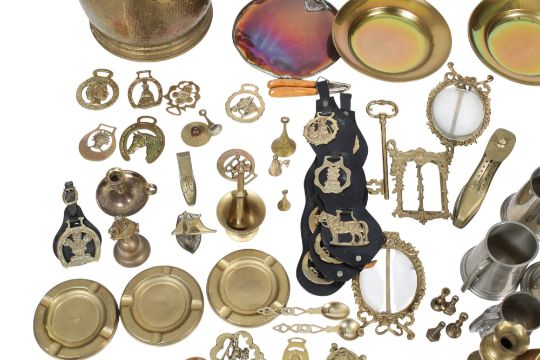 An assortment of Victorian and later metalware. Including horse brasses, pewter tankards, a copper coal bucket, silver plated leaf dish, trench art, etc. largest H28cm