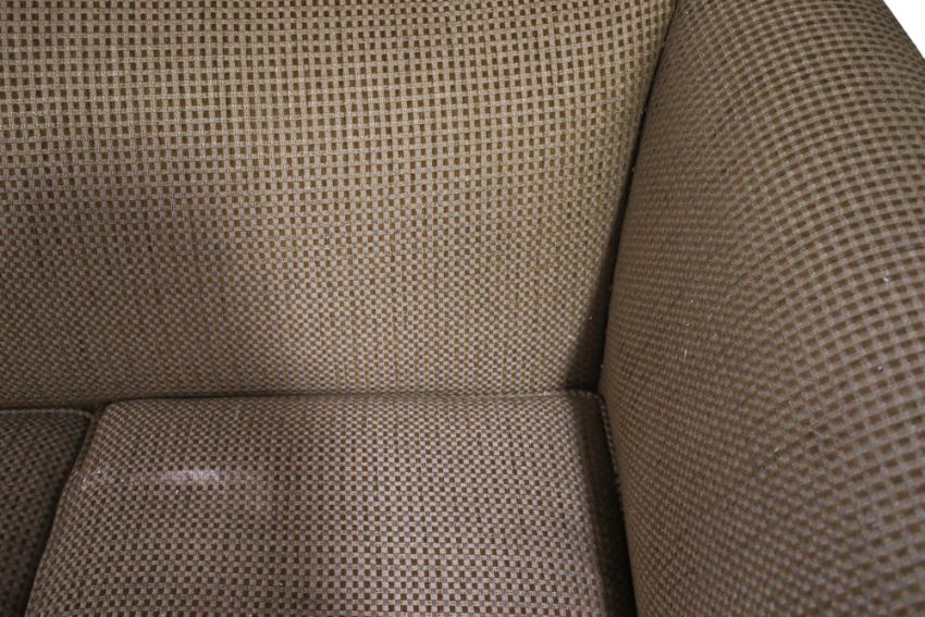 A vintage three seater sofa. Having a shaped backrest and scrolled arms, upholstered in brown and grey chequered fabric, raised on wooden ribbed supports, H90cm x W190cm x D80cm