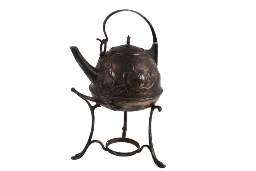 A Liberty style kettle on stand. The beaten kettle decorated with embossed flowers, total H32cm