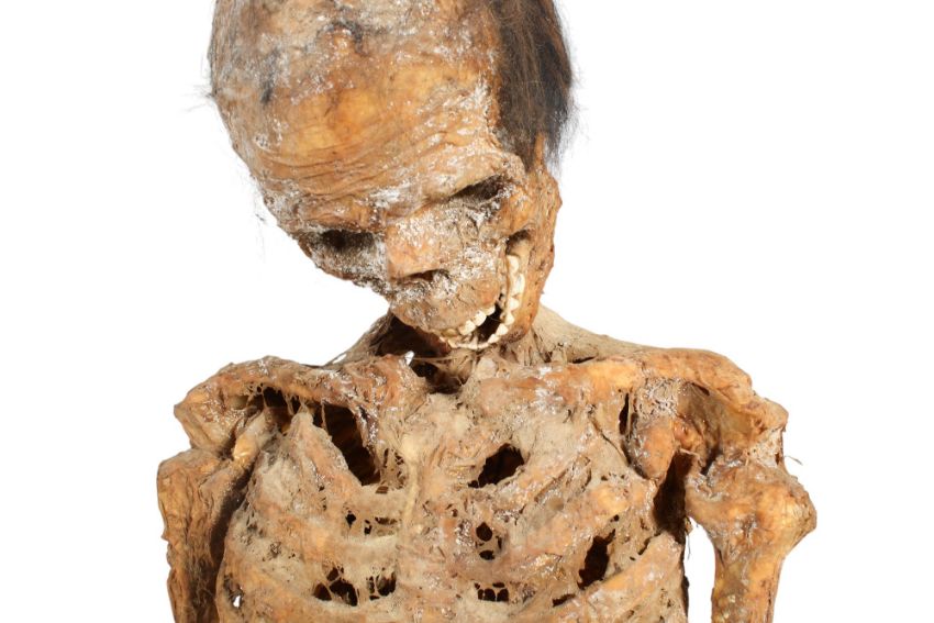 A novelty model of a skeleton. With adjustable limbs, covered in a stained plastic film, with fake teeth and hair, mounted on a rolling stand, H162cm