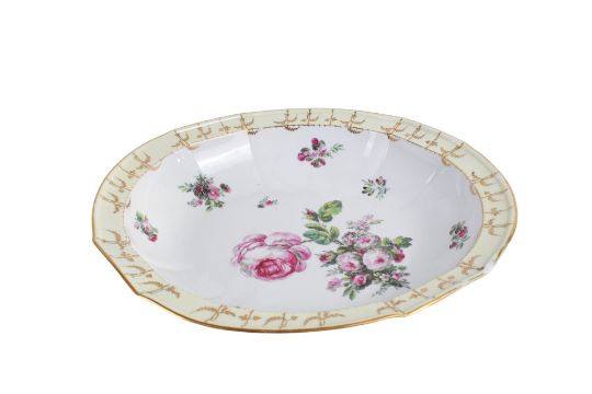 A KPM ceramic dish. Hand painted with flowers, within a cream and gilt boarder, L33cm