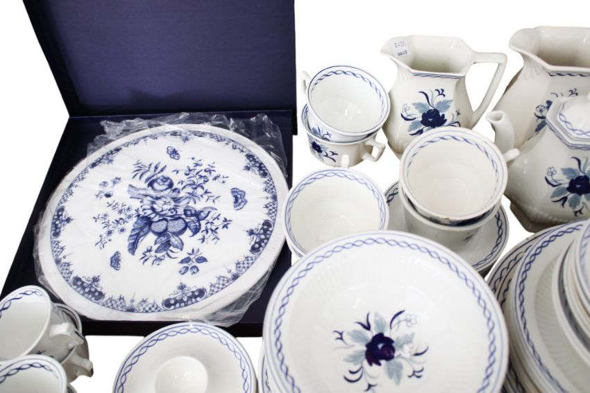 Plates: 10 small, 8 mid, 2 large, 4 larger; 2 teapots, one water pot, 3 jugs, 7 soup bowls, sugar bowl, 6 teacups and 6 saucers, 7 coffee cups, 7 smaller saucers and 2 larger deeper saucers, 4 egg cup dishes, 7 small bowls.