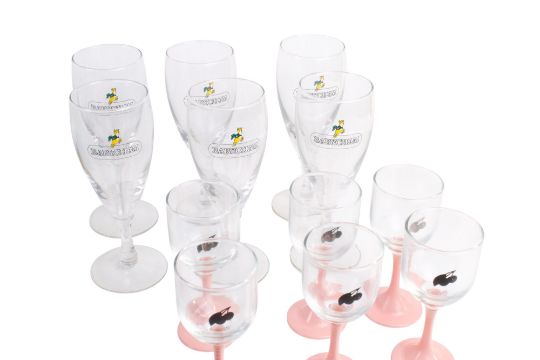 A collection of assorted Babycham collectables. Including six glasses, shopping bags and tea towels, etc.