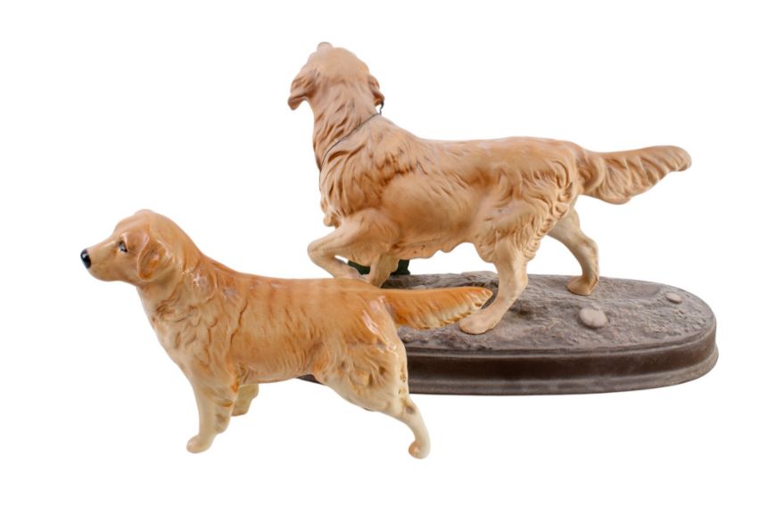 Two Beswick Pottery golden retriever dog figures. The larger having a bisque finish, the smaller glazed. Max. H19cm