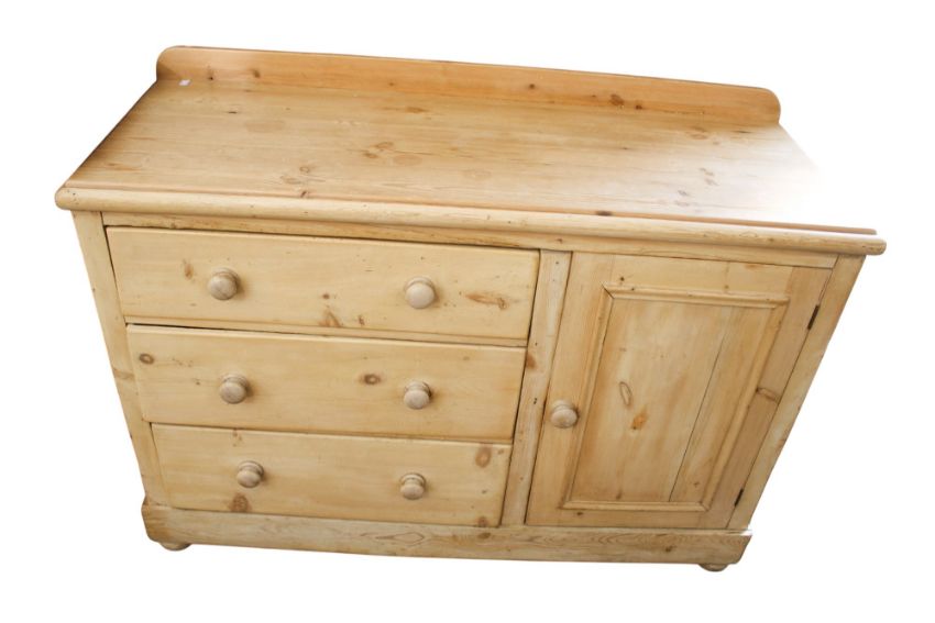A stripped pine cabinet. With three drawers and one cupboard door, turned handles, on bun feet. H93cm x W135cm x D50.5cm