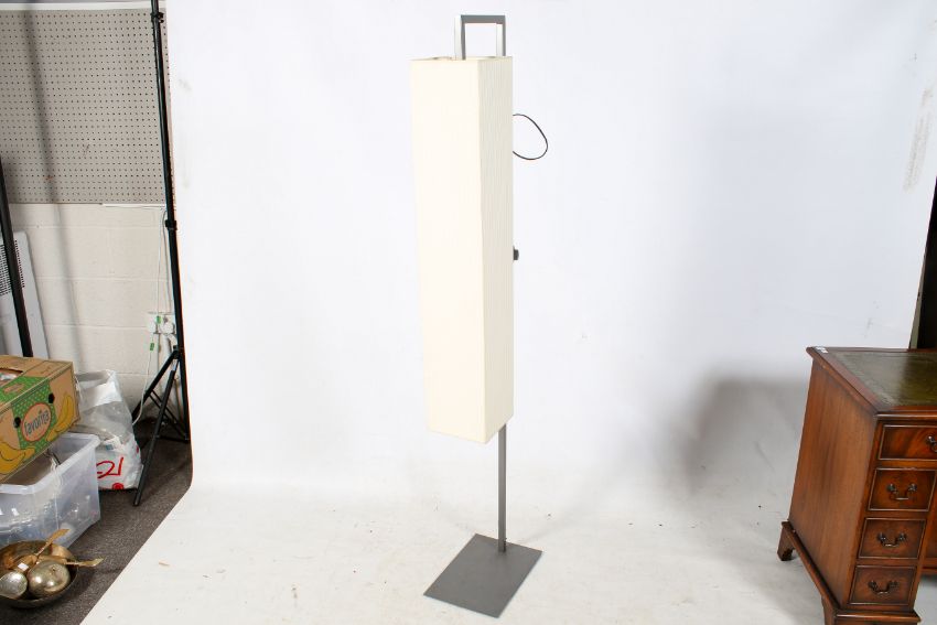 A contemporary grey metal floor lamp with rectangular shade. H170cm