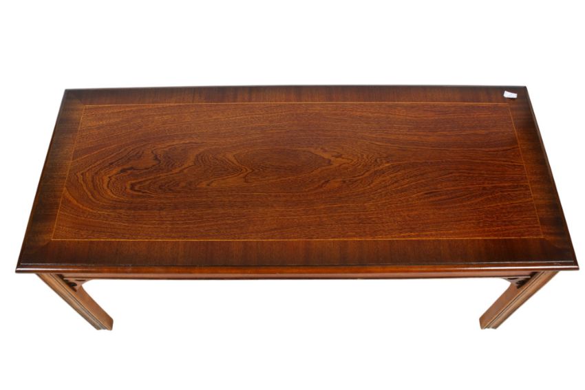 Two contemporary tables and a Victorian child's chair. Comprising a moulded edge coffee table with carved brackets and reeded supports, H43cm x W106cm x D46cm, an oak framed rocker with green velvet upholstery, H37cm, and a 19th century style occasional table with inlaid details, a shaped top and applied metal decoration, H72cm x W50cm x D33cm