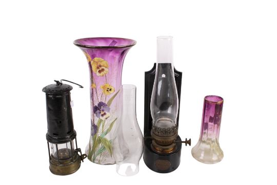A group of various lamps, and vase. Including oil lamps, two enamelled glass vases and a brass miner's lamp. Max. H57cm