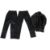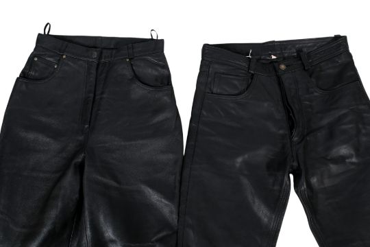 Two pairs of vintage leather trousers and a jacket. Circa 1990s, the jacket lined in black fabric with popper fastenings, L76cm x chest W56cm, the trousers including a pair of black leather Camanchi trousers with branded buttons, L105cm x waist 30", and a pair of Milano black Leathermaster trousers, L108cm, size 10
