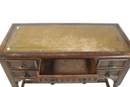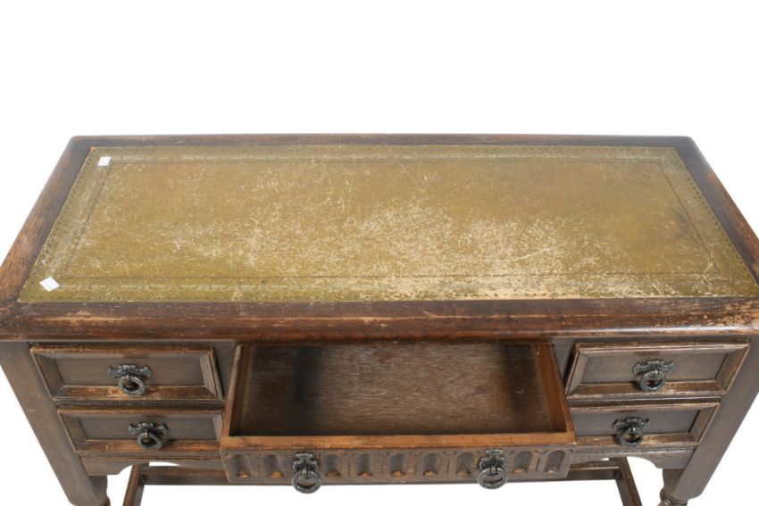 A mid-century carved oak desk with green inset leather top. Central drawers flanked by two drawers, raised on baluster supports united by stretcher. H74cm x W107cm x D46cm