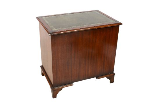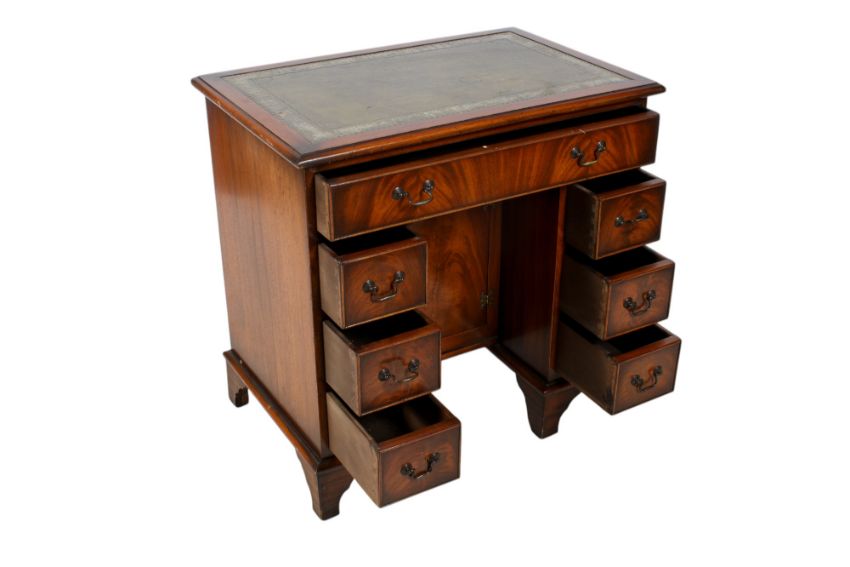 A Georgian style mahogany knee hole desk. Having green inset leather top, a drawer over kneehole flanked by three drawers raised on bracket supports. H76cm x W76cm x D51cm