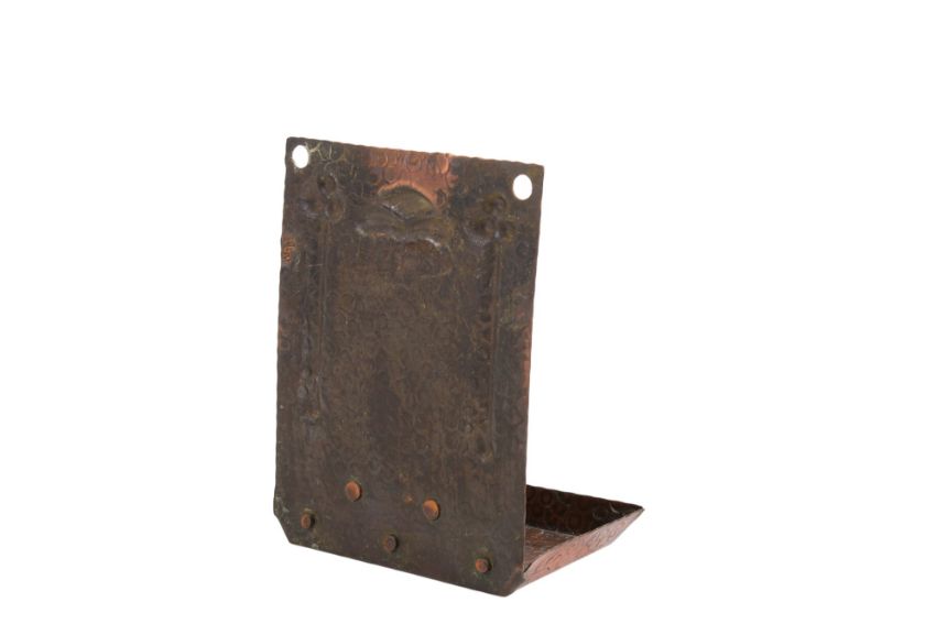 A Newlyn School style copper matchbox holder. The beaten copper finish with stylised embossed decoration and studded seams, a tray positioned beneath, 11.5cm high