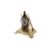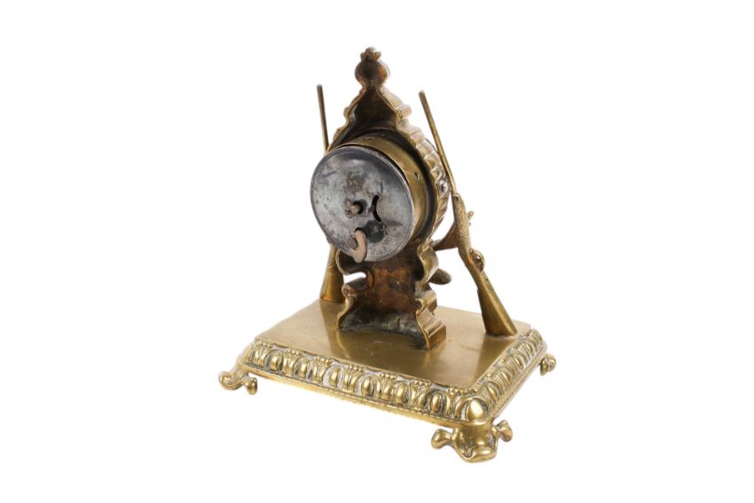 A Victorian brass desk clock. The white dial with Arabic numerals mounted in a hunting-themed stand featuring two guns and a stag's head, on a rectangular base with scroll feet, H18cm