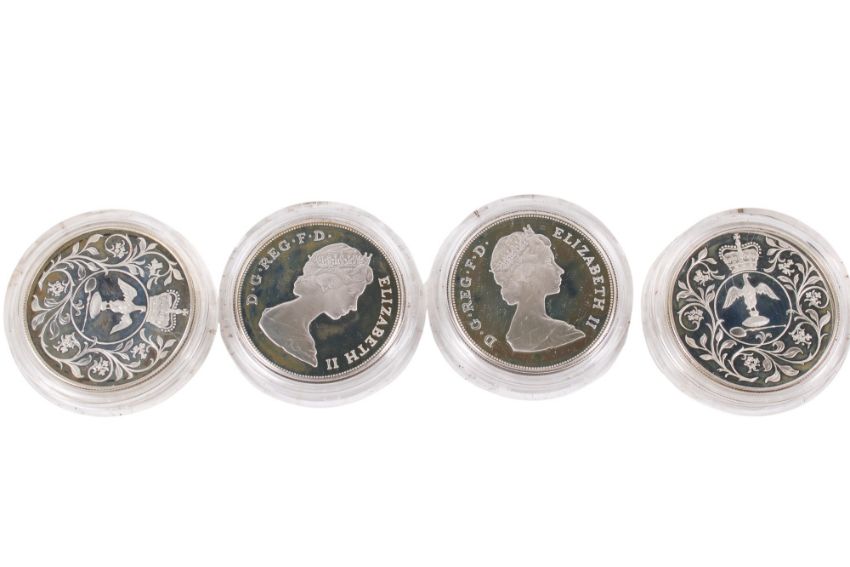 Four commemorative silver proof coins. Comprising two crowns for The Queen's Silver Jubilee, and two coins for the marriage of Price of Wales and Lady Diana Spencer in 1981, each weigh 28.2g, diameter 38.6mm, all boxed and with leaflets.