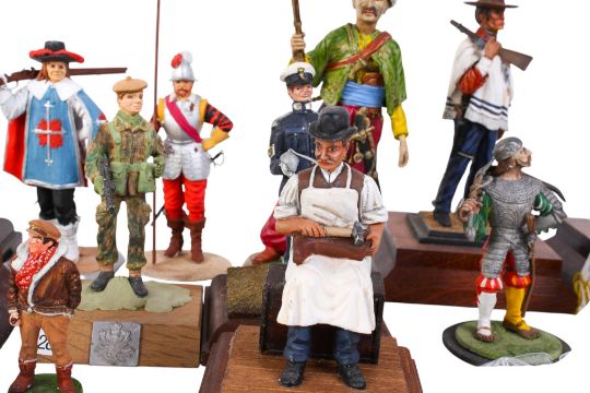A group of hand painted lead and resin military figures. Including British Army personnel, US Cavalry Seargent, a seated cobbler, 'Sleeping Cowboy', etc, most on stands, the Sleeping Cowboy measuring 6.5cm x 17.5cm x 11cm including base.