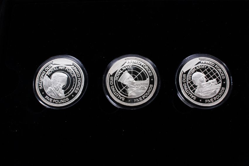 Two silver proof sets of Guernsey £5 coins. Dated 2012, 2014, with three £5 coins in each set, Tribute to the Armed Services
