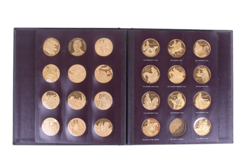 A set of 35 'Chaucer and the Canterbury Tales' bronze medallions. 'Tale of Melibe' is missing