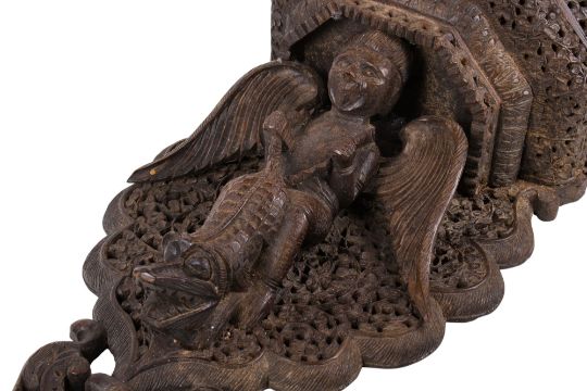 A Burmese Anglo-Indian large carved hardwood wall bracket. Circa 1880, the angular top heavily decorated with scrolling foliage, featuring an angel holding a crocodile by its tail, terminating in a motif, height 57cm
