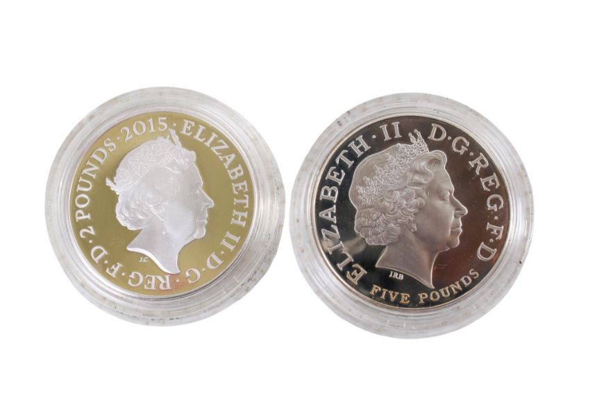 Two modern proof coins. Consisting of a 2006 silver proof Piedfort £5 coin; a 2015 silver proof £2 coin commemorating battle of Waterloo